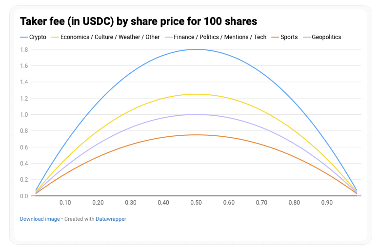Polymarket rolled out a new fee structure on March 30, 2026. Maker fees are 0% (with rebate incentives). Taker fees follow a probability-linked dynamic schedule.