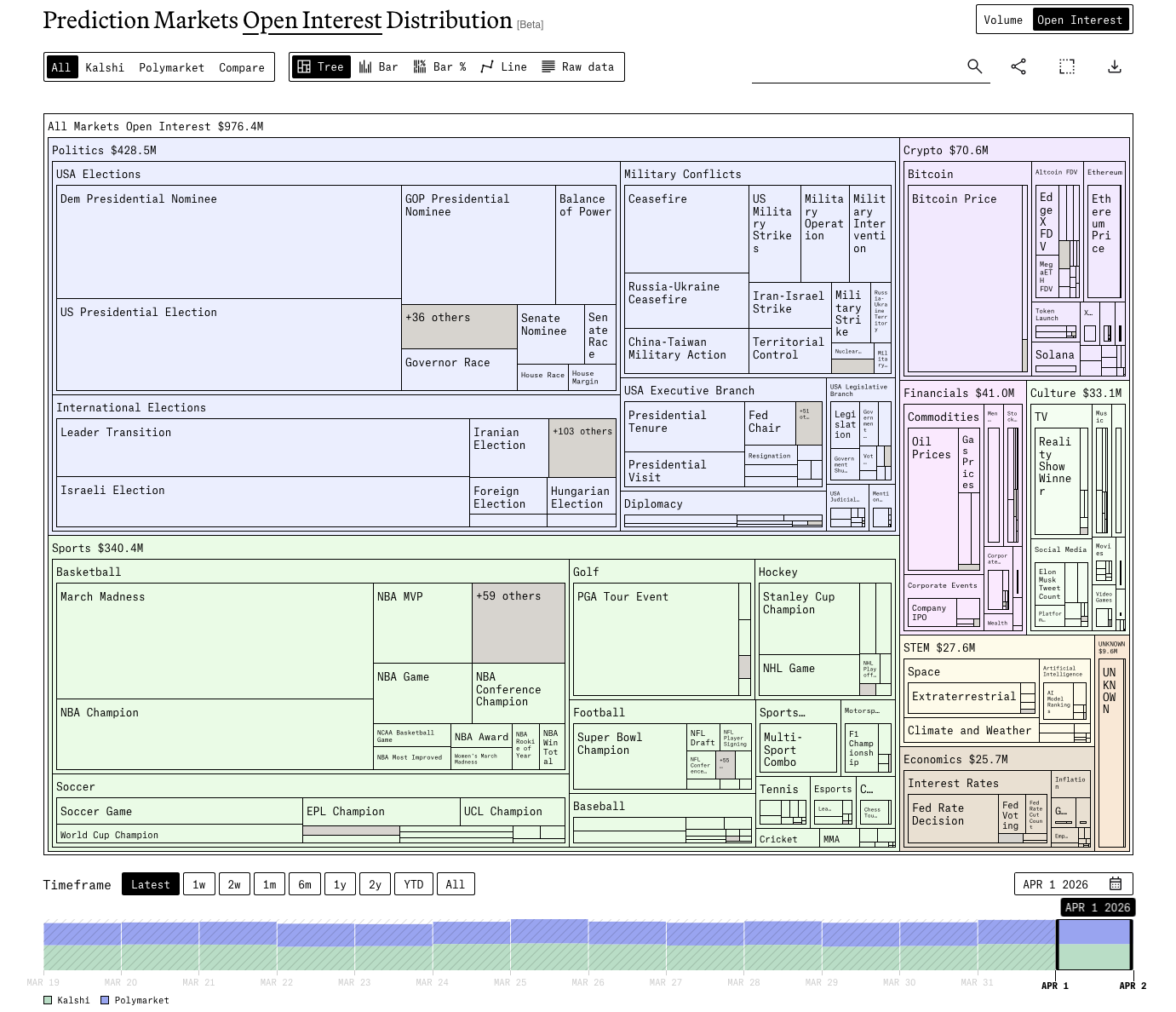 Figure 1: Open interest distribution across mainstream prediction markets. Block size reflects capital volume. (Source: predictions.paradigm.xyz)