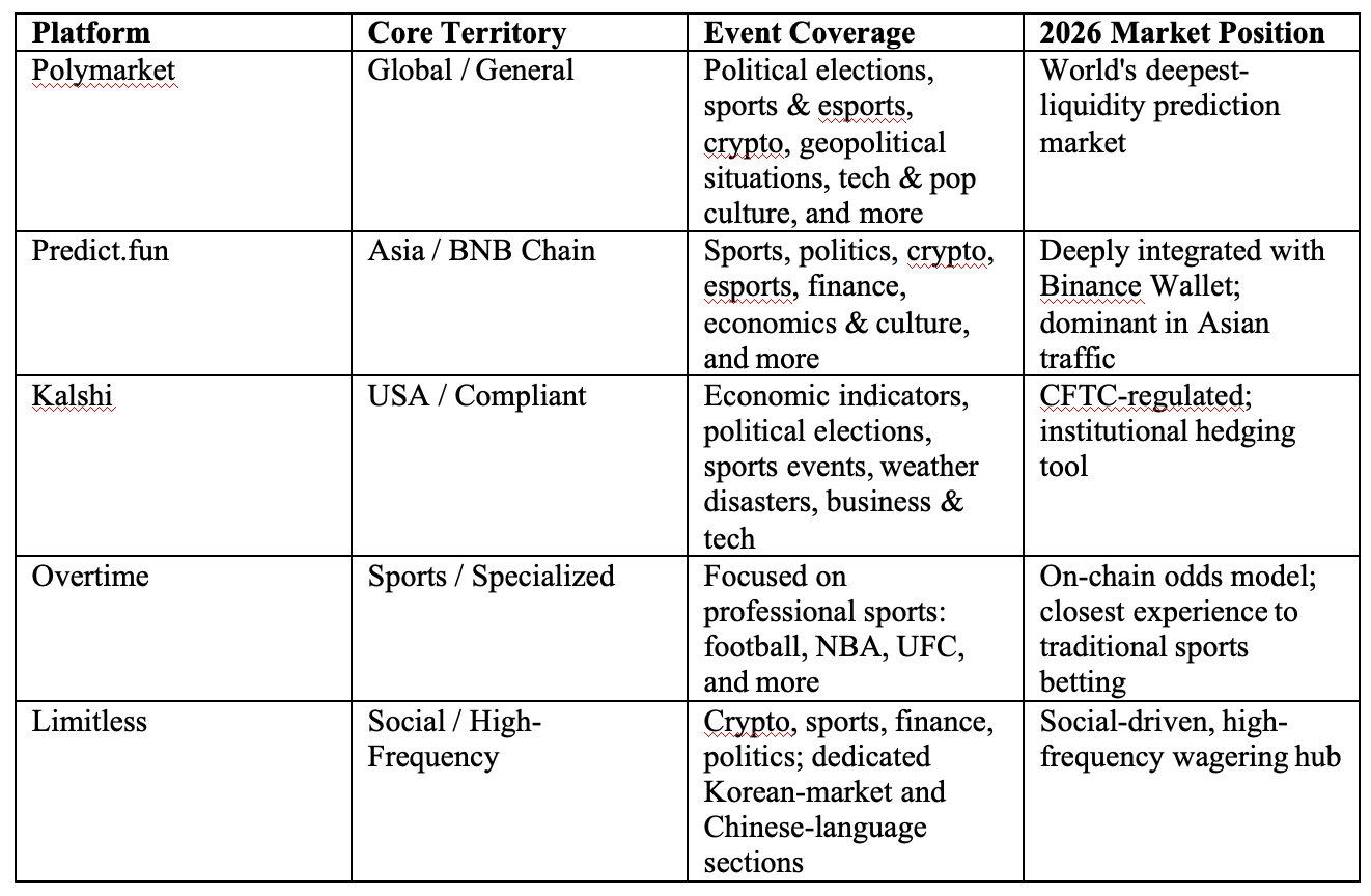 The 2026 prediction market landscape is defined by differentiation. Each major platform has carved out a distinct corner of global uncertainty: