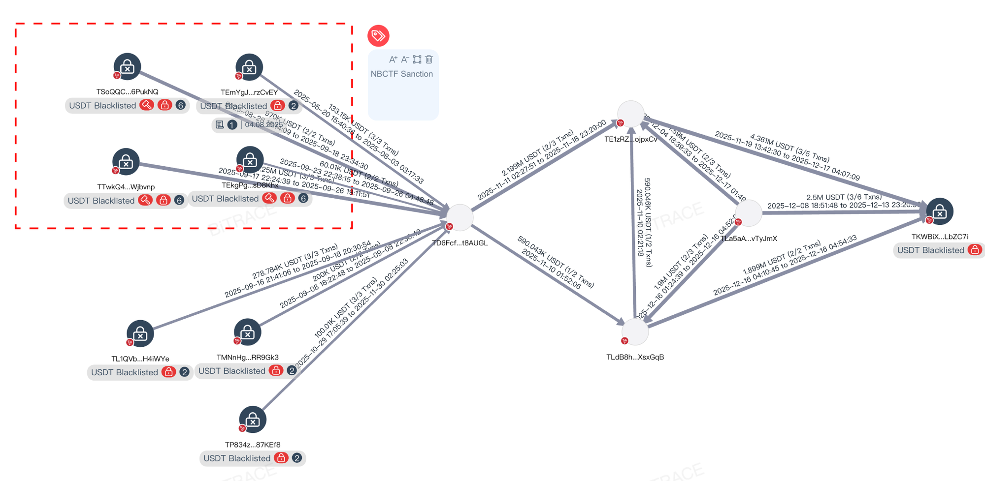 Its primary funding sources include multiple blockchain addresses that had previously been blacklisted. According to the NBCTF official website, four of these addresses appear on the Seizures of Cryptocurrency list under ASO 41/25, ASO 50/25, and ASO 51/25, and were frozen by Tether between August 4 and September 30, 2025.