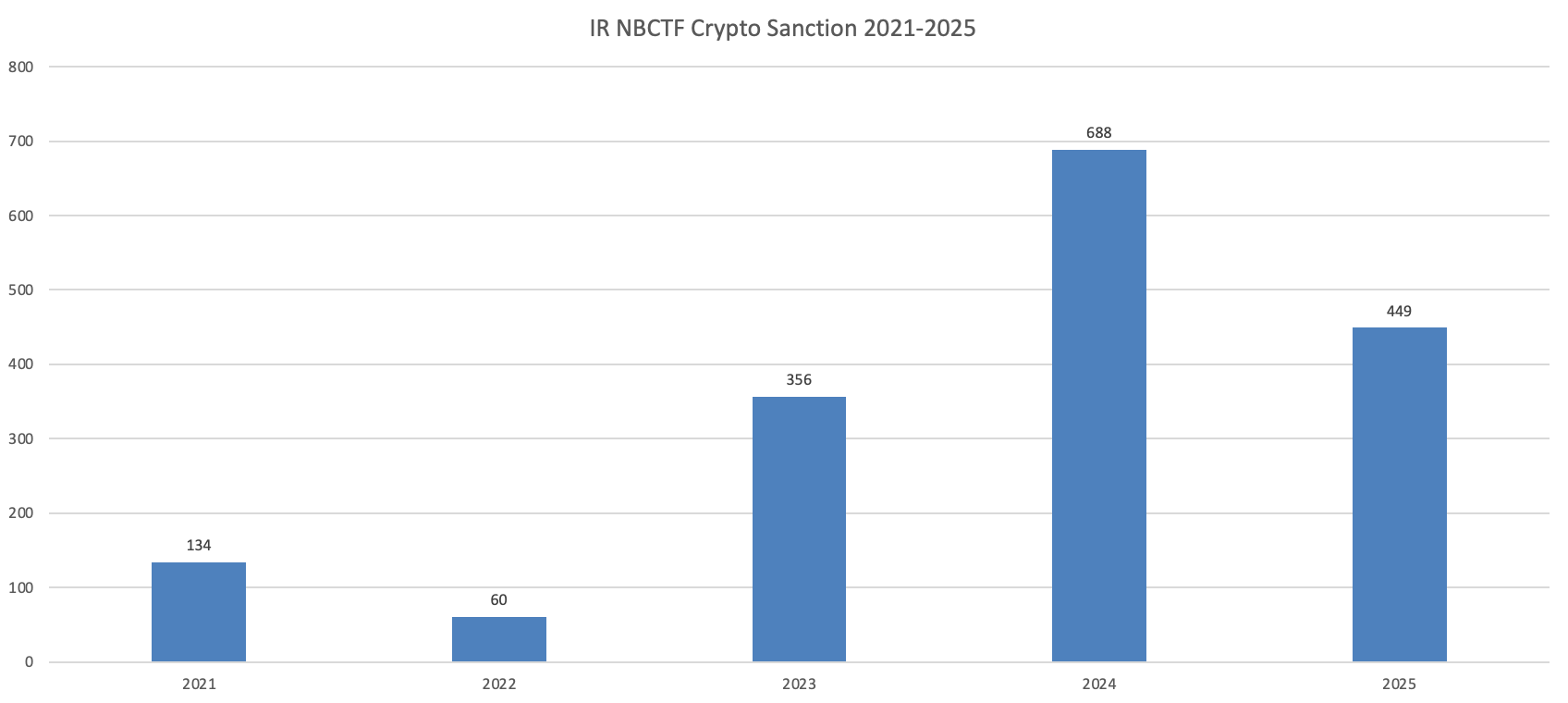 Bitrace monitoring data shows that between 2021 and 2025, the Israeli government sanctioned a total of 1,687 blockchain addresses or exchange accounts. Nearly all administrative orders occurred during the 2023–2025 wartime period, with sanctioned targets primarily consisting of terrorist entities or their financing channels.