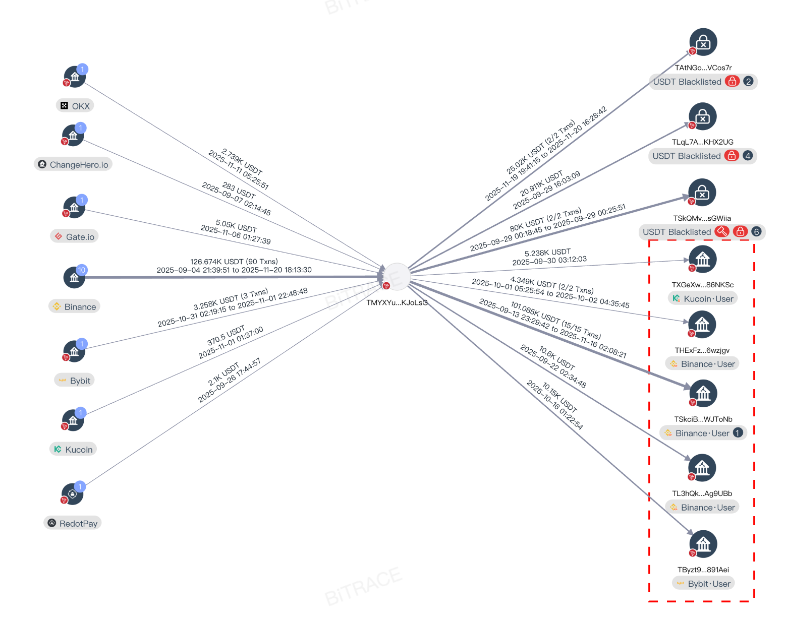 Using these sanctioned addresses as an example, further upstream fund analysis reveals a substantial number of small transfers originating from centralized exchanges, which are later aggregated and then transferred in batches to specific addresses and exchange accounts.