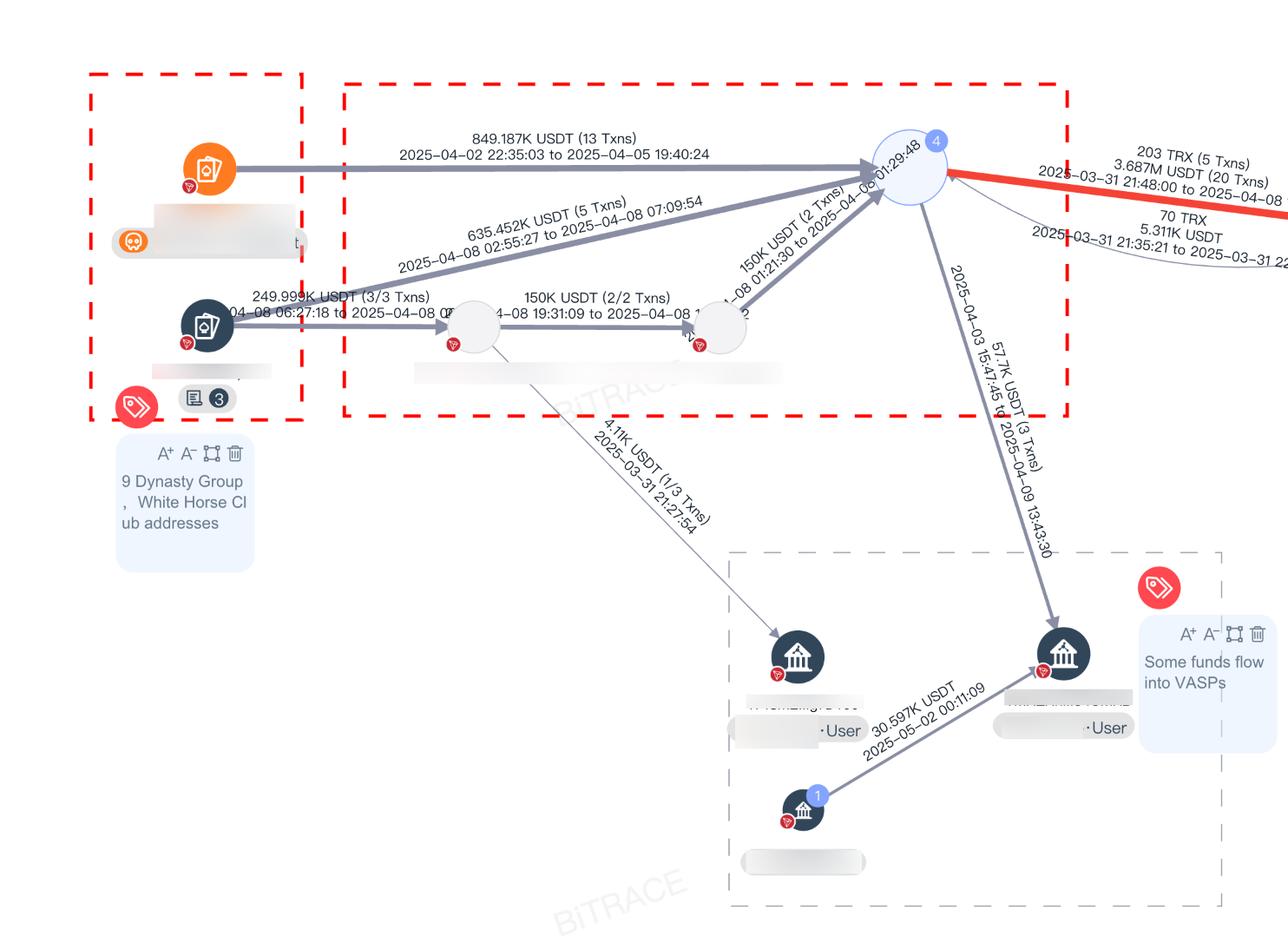 Utilizing its threat intelligence database, Bitrace conducted an in-depth investigation into transaction activities involving addresses associated with 9 Dynasty Group and White Horse Club during the crime period. By tracing downstream laundering routes, investigators successfully mapped and reconstructed the initial USDT transfer path.