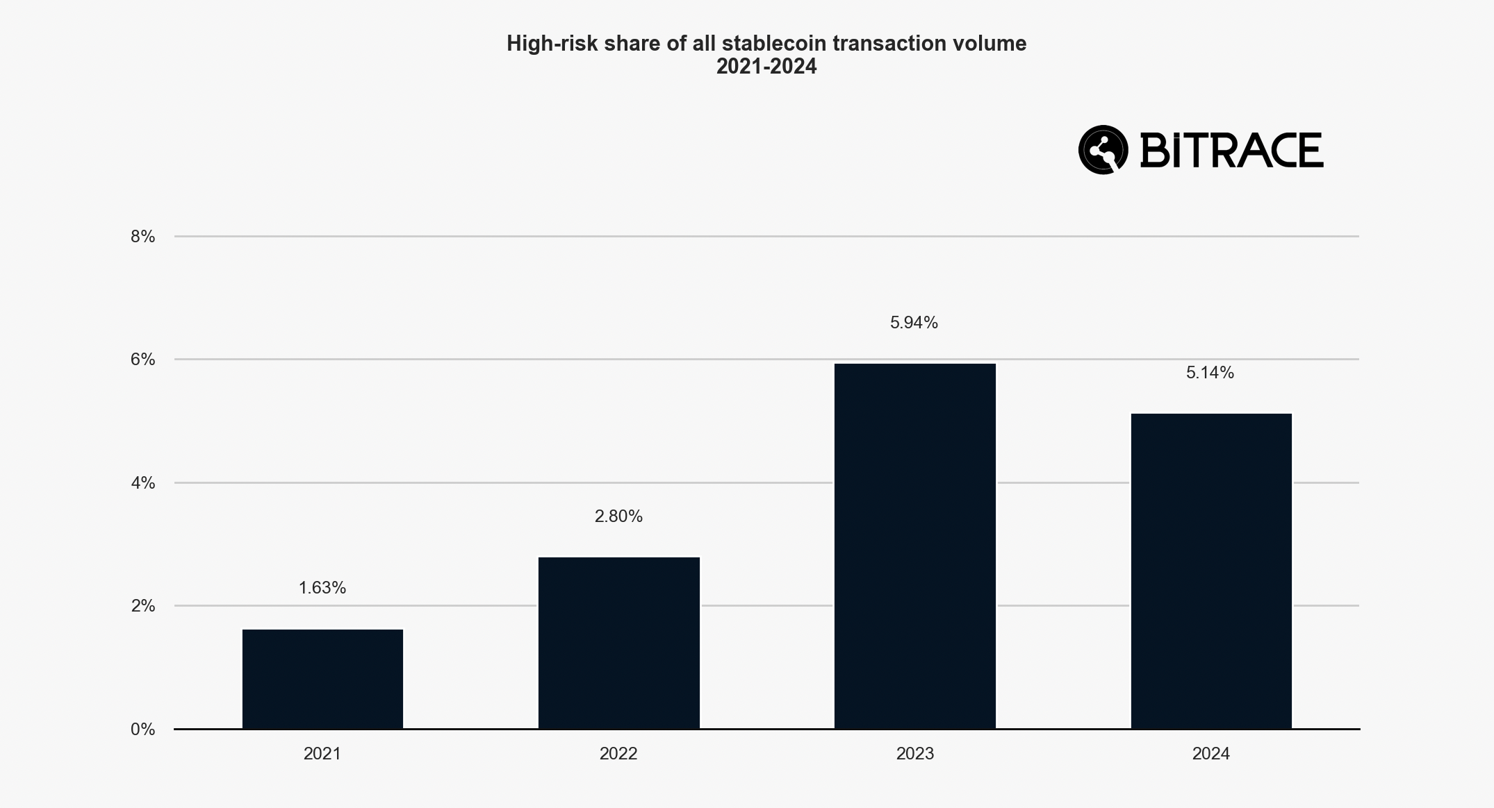 Stablecoins, as a fundamental infrastructure of the crypto industry, have been widely adopted by high-risk entities. According to Bitrace's 2025 Crypto Crime Report, transactions involving stablecoins in high-risk activities now account for more than 5% of total transaction volume, posing a significant financial threat to compliant enterprises and retail investors.