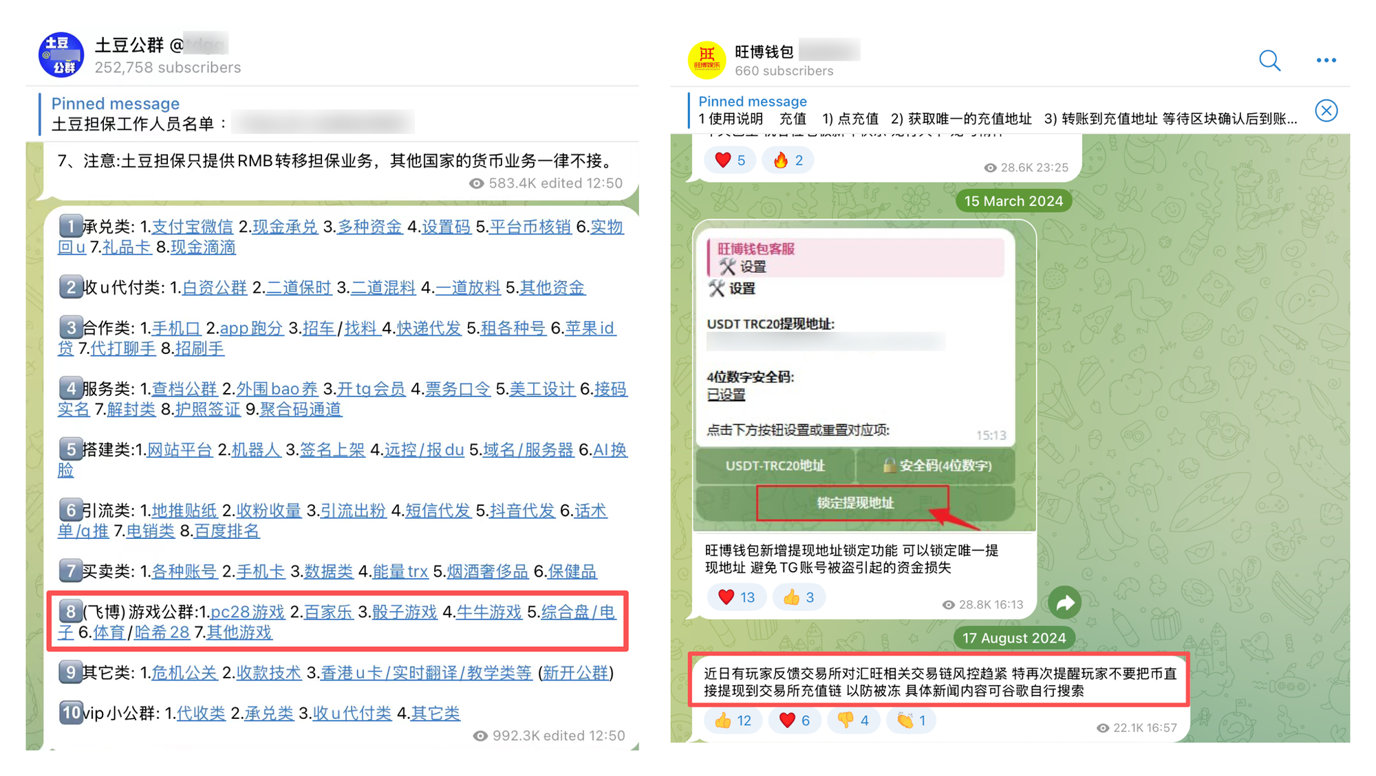 Before it collapsed, Huione's Telegram-based online gambling portal Feibo (@Feibo) ran joint public groups with several prominent gambling platforms. The closest partner was Wangbo (@Wangbo). Huione Guarantee opened traffic-generating public groups on Wangbo's behalf and helped it build WangboWallet — a USDT settlement tool on the Tron network, built on top of Huionepay's SaaS infrastructure.