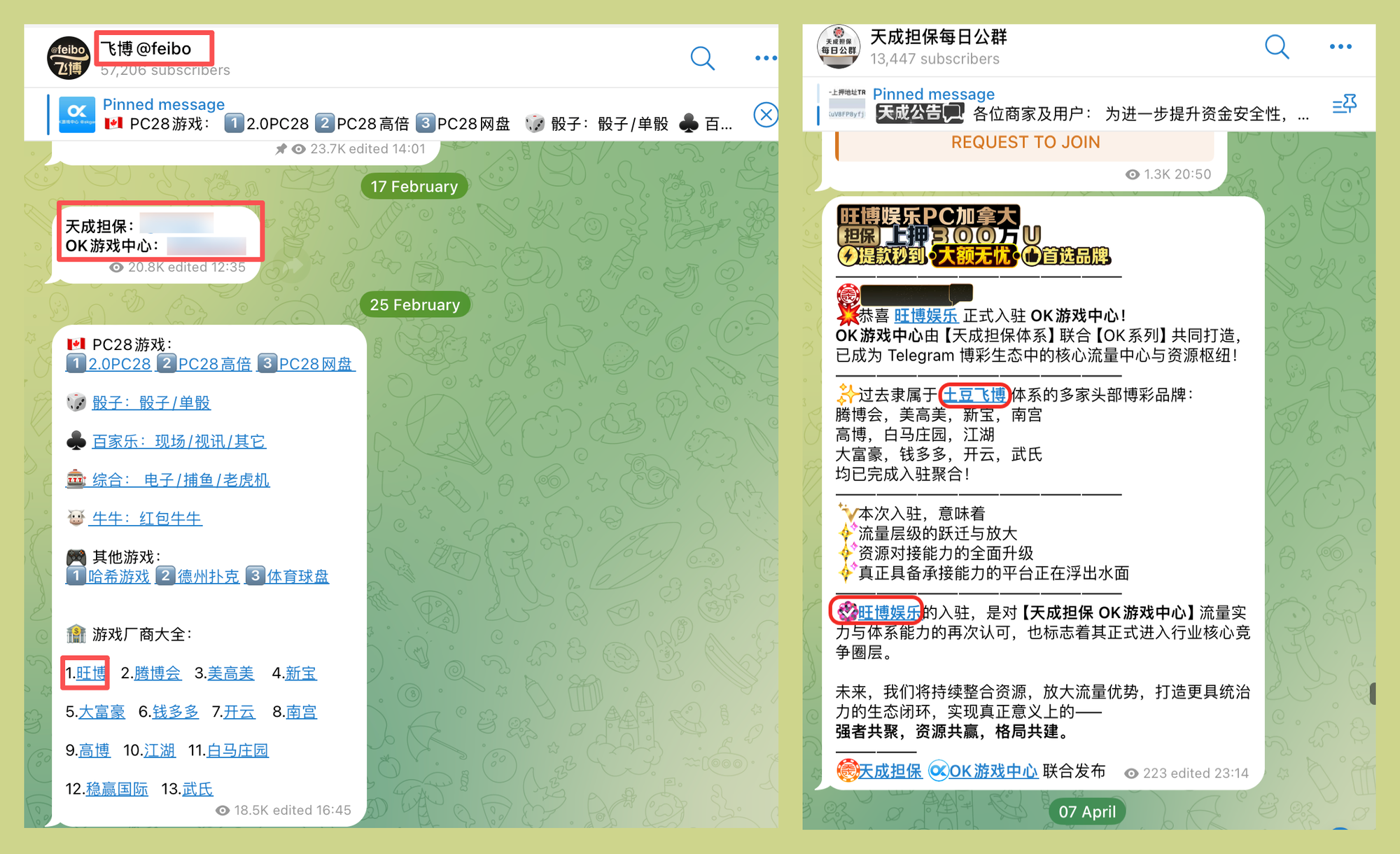 The gambling public groups that previously ran under Tudou Guarantee have similarly migrated in bulk to Tiancheng Guarantee and a venture called OKGAME. Wangbo Entertainment has since onboarded OKPAY as one of its settlement channels.