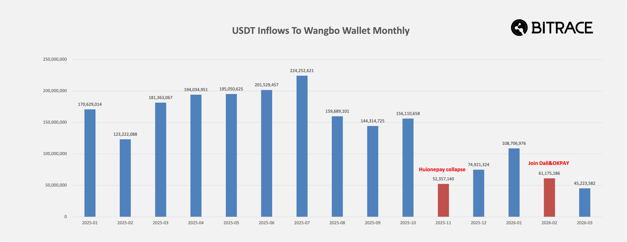Using the November 2025 Huionepay payment crisis and the February 2026 OKPAY integration as key reference points, Bitrace analyzed USDT transaction activity across Wangbo's official settlement addresses over the preceding 15 months.